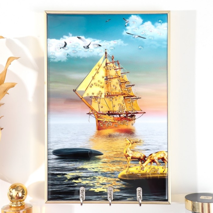 Ключница пластик, МДФ 3 крючка "Сияние корабля" стразы, золото 19,3х1,8х29 см