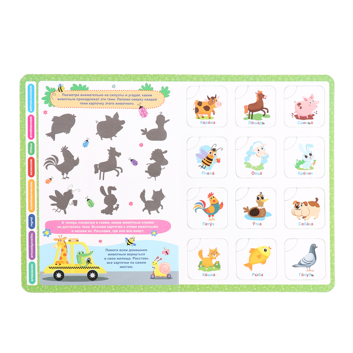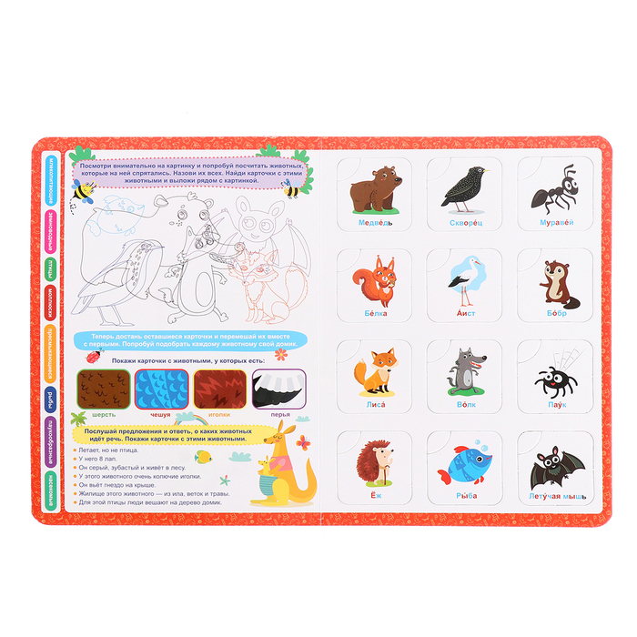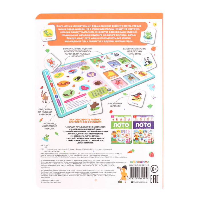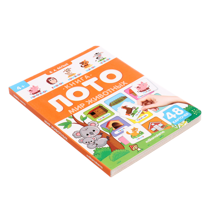 С книгой-лото «Мир животных» ребёнок в занимательной форме познакомится многими животными и узнает о них полезную информацию. На 8-ми страницах малыш найдет 48 карточек, которые помогут выполнить множество увлекательных и развивающих заданий, созданных по методике Виктории Белых — педагога-психолога с 25-летним стажем работы с детьми.