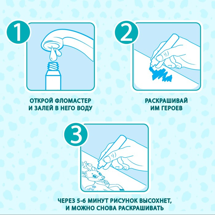- Через 5–6 минут вода высохнет, и картинку можно снова раскрашивать.