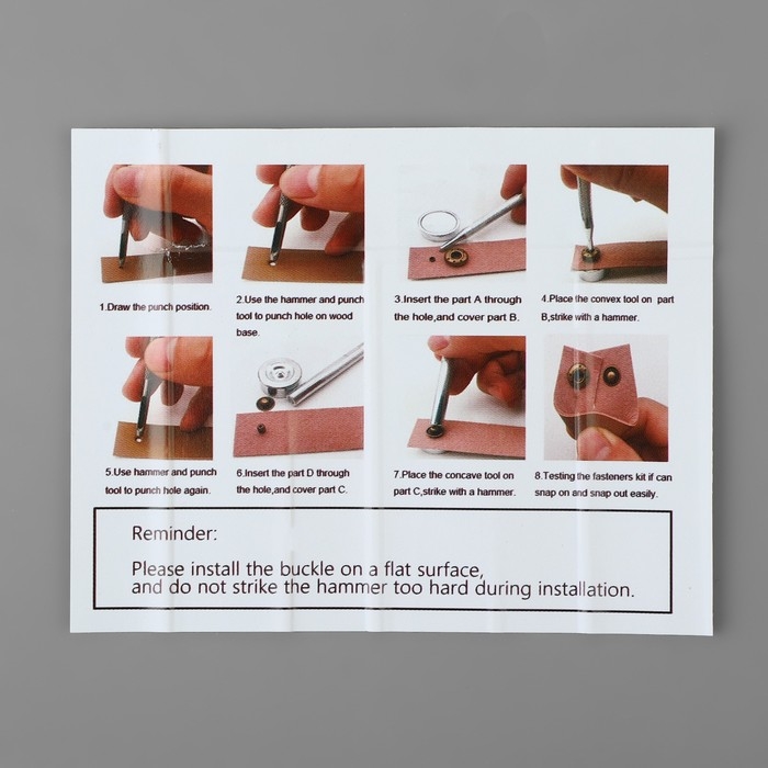 Застёжки выполнены из нержавеющей стали — они прочные и износостойкие, выдерживают воздействие солнечных лучей и перепады температур. С установщиком вы без особых усилий сможете прикрепить кнопки.