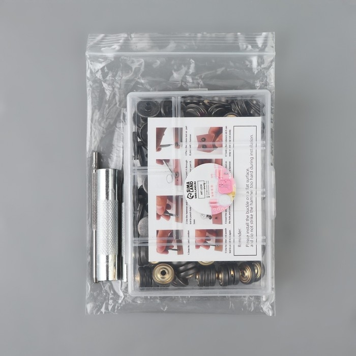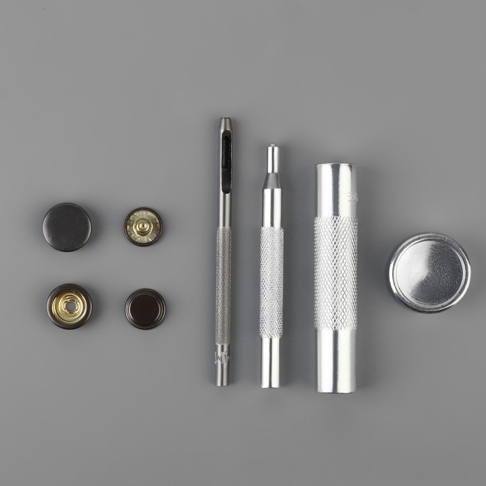 Набор O-образных кнопок с установщиком пригодится для ремонта или создания изделий из тканей средней плотности, натуральной и искусственной кожи.