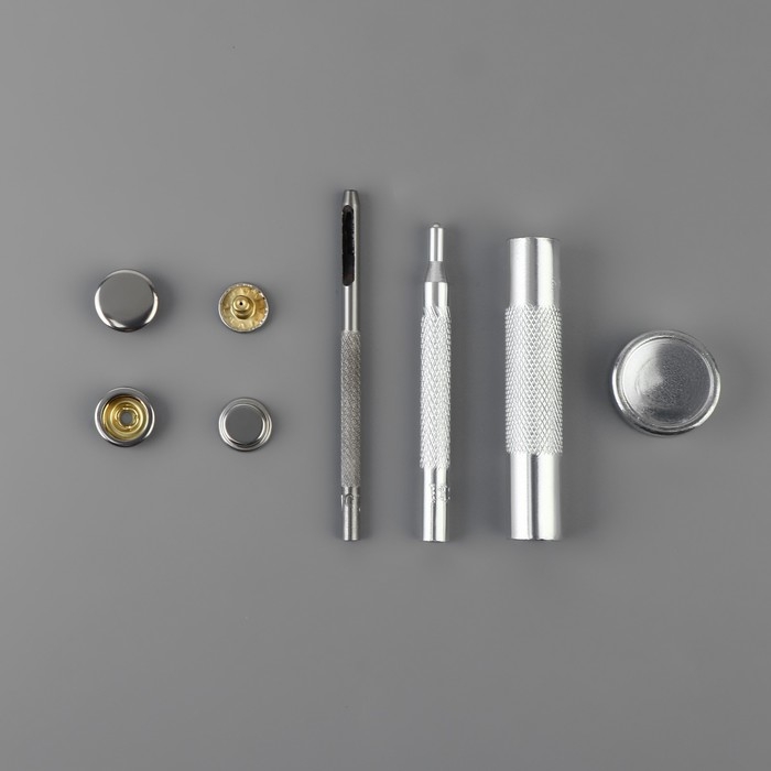В наборе: 40 кнопок, d = 15 мм, цвет серебряный; установщик; пластиковый органайзер для хранения.