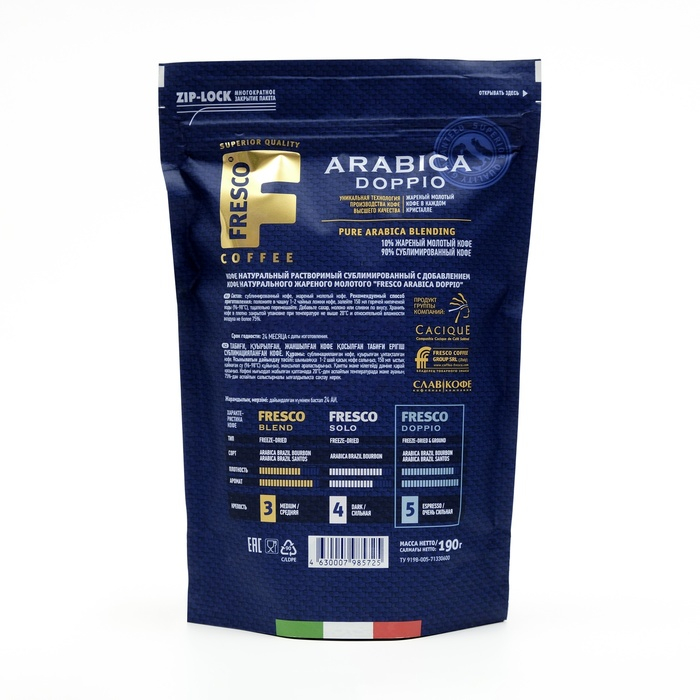 Кофе Fresco Doppio создан по уникальной технологии производства растворимого кофе высшего качества при которой молотый жареный кофе «арабика премиум» становится неотъемлемой частью каждого кристалла растворимого сублимированного кофе, что обеспечивает неповторимый стойкий аромат сразу на этапе заваривания.