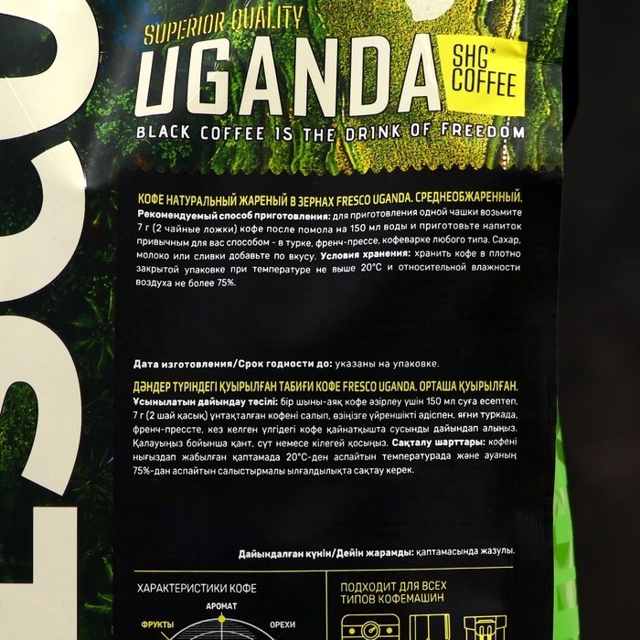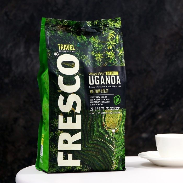 Известно, что в Уганде идеальные климатические условия для выращивания кофе. В прохладных горных регионах зерна приобретают более сложный букет. Почти всю продукцию производят на небольших фермерских хозяйствах, кофе выращивают в естественной тени других деревьев. Кофе Уганды представлено сортом арабики Bugisu, а для придания дополнительных вкусовых красок в купаж кофе FRESCO UGANDA добавлена робуста сорта Nganda.