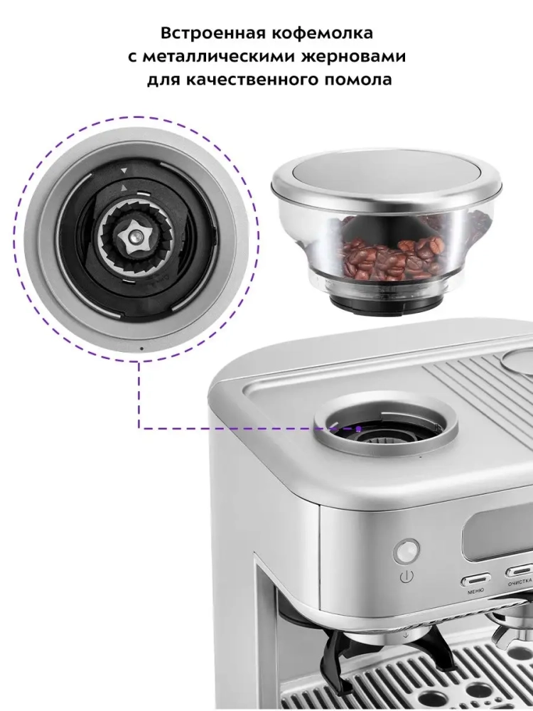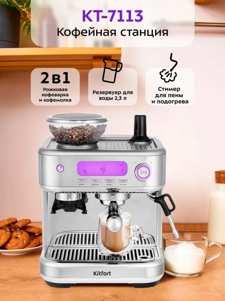 Кофейная станция Kitfort КТ-7113 сочетает в себе два устройства в одном корпусе: рожковую кофеварку и кофемолку. Рожковая кофеварка поможет приготовить кофе эспрессо, капучино или латте, а также множество других видов кофе на ваш вкус. С помощью стимера вы можете приготовить молочную пенку, а также подогреть паром остывший чай или молоко. Встроенная кофемолка с коническими металлическими жерновами позволяет качественно измельчать кофейные зерна непосредственно перед приготовлением кофе, что положительно отражается на вкусе готового напитка.