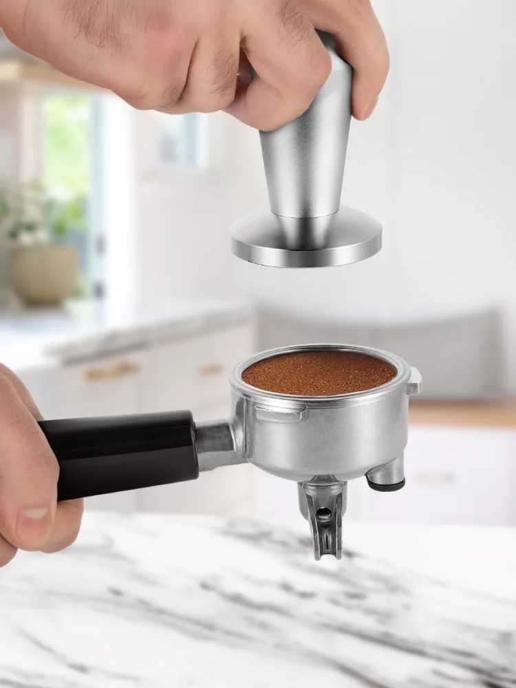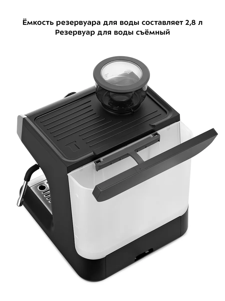 Металлический фильтр с лазерным нанесением отверстий долговечен и не требует использования каких-либо расходующихся частей. Кофейная станция оснащена съемным резервуаром для воды и металлическим рожком. Металлический рожок хорошо прогревает напиток, а сам напиток получается насыщенным, густым и с хорошей пенкой. Темпер поможет утрамбовать в рожке кофейную таблетку.