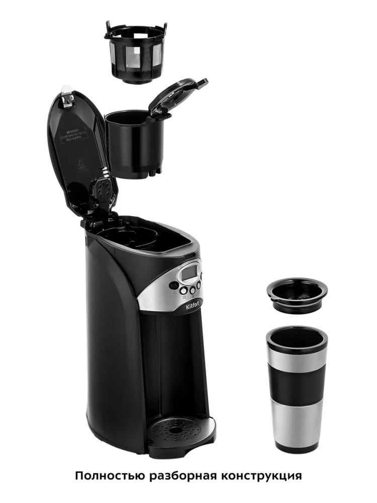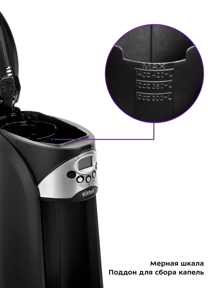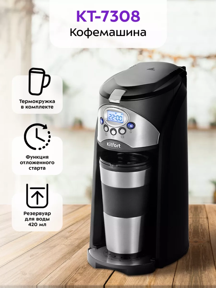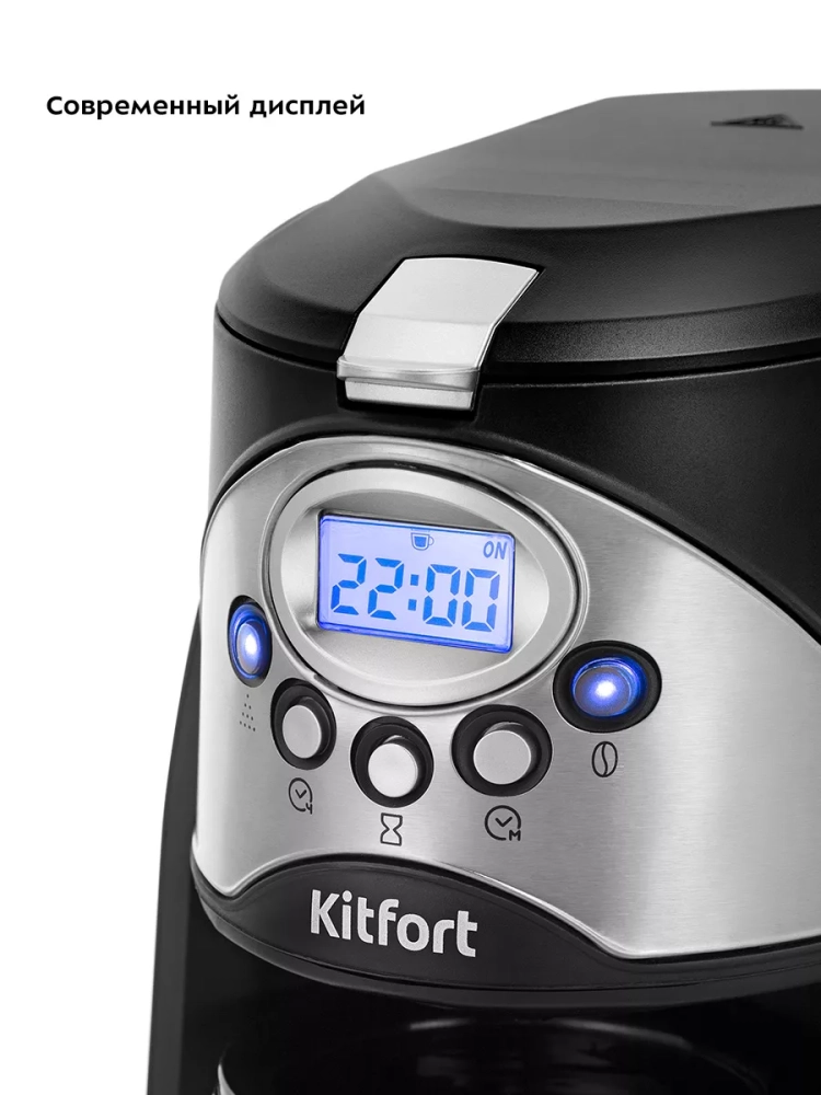 Кофемашина Китфорт KT-7308 оборудована дисплеем, который показывает текущее время и заданные настройки. Функция отложенного старта позволит начать приготовление в заданное вами время. Вам больше не придется вставать утром на 20 минут раньше, чтобы успеть сделать себе ароматный кофе. Также кофемашина оснащена поддоном для сбора капель, который защищает поверхность стола. Кофемашина предназначена для приготовления кофе в домашних условиях или в офисе.
