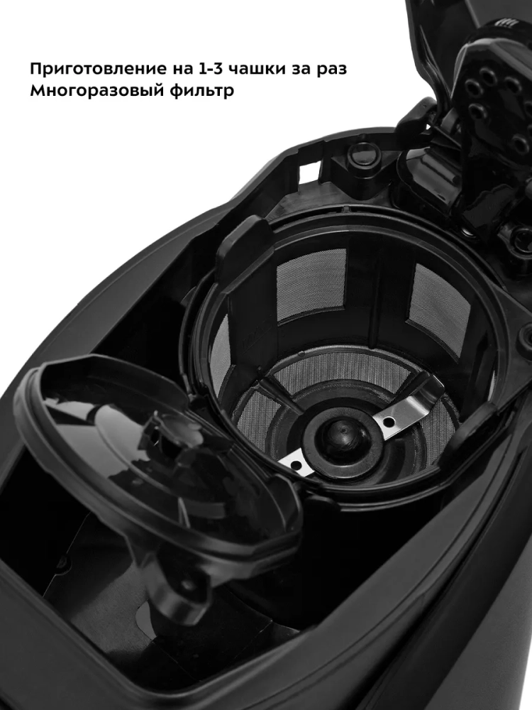 Компактная кофемашина KT-7308 рассчитана на приготовление кофе за 1 раз на 1–3 чашки. Многоразовый фильтр вмещает 20 грамм кофейных зерен или молотого кофе. А в резервуаре для воды есть специальные отметки 300, 360 и 420 мл, которые помогают налить необходимый объем воды для приготовления кофе.