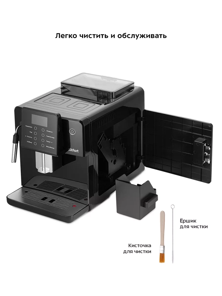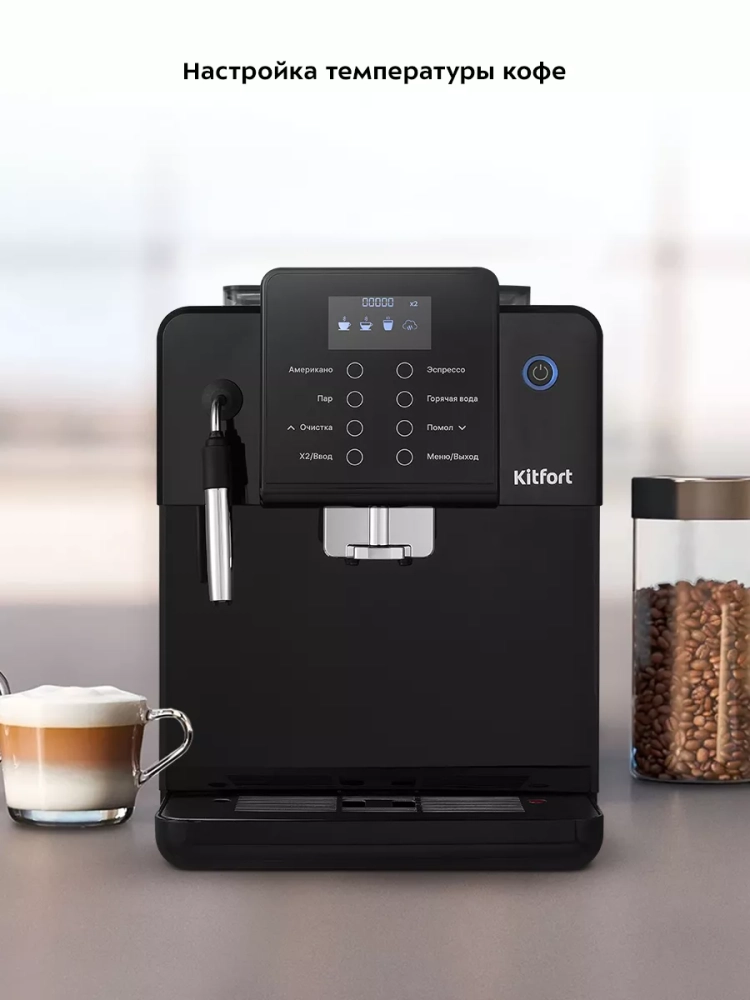 Кофемашина Китфорт KT-7182 позволяет настроить крепость кофе, объем и температуру кофе, а также время подачи пара. Также вы можете включить режим энергосбережения — через выбранное время, в течение которого кофемашина не будет использоваться, устройство отключится.
