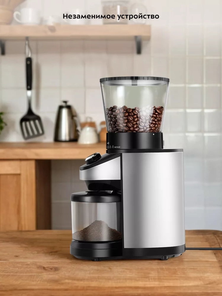 Жерновая кофемолка дает равномерный помол и позволяет настроить его степень: от мелкого — для рожковой кофеварки, до крупного — для френч-пресса. Равномерный помол важен для рожковых кофеварок: при неравномерном помоле вкус заваренного кофе портится. При помоле в жерновой кофемолке кофе не перегревается, как это происходит в роторных кофемолках. Вы можете выбрать, какое количество порций молотого кофе требуется намолоть за один раз. Количество порций представлено в условных единицах и примерно равно количеству чашек эспрессо. Кофемолка намелет нужное количество кофе и автоматически выключится.