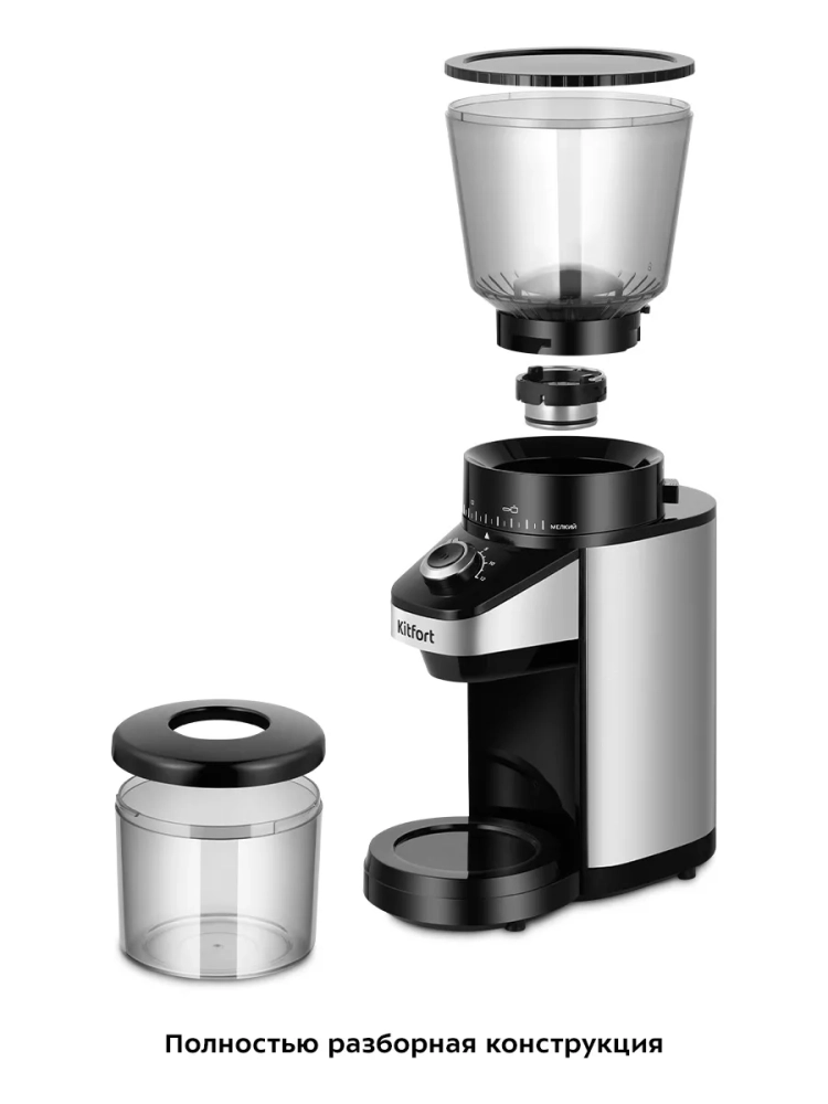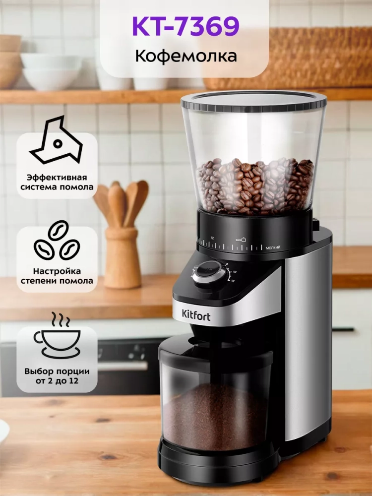 Жерновая кофемолка Kitfort КТ-7369 предназначена для помола кофейных зерен. Она оснащена коническими жерновами из нержавеющей стали.