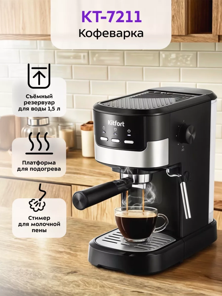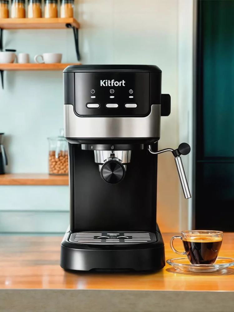 Рожковая кофеварка Kitfort КТ-7211 поможет приготовить кофе эспрессо, капучино или латте, а также множество других видов кофе на ваш вкус. С помощью стимера в рожковой кофеварке вы можете подогреть паром остывший чай, молоко или другие напитки.