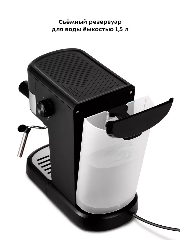 Металлический фильтр с лазерным нанесением отверстий долговечен и не требует использования каких-либо расходующихся частей. Кофеварка оснащена съемным резервуаром для воды и металлическим рожком. Металлический рожок хорошо прогревает напиток, а сам напиток получается насыщенным, густым и с хорошей пенкой. Мерная ложка-темпер поможет наполнить рожок и утрамбовать в нем кофейную таблетку.