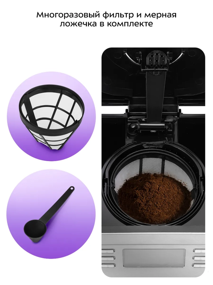 При приготовлении кофе вода нагревается, а затем подается в фильтр с молотым кофе. Многоразовым фильтром можно пользоваться неограниченное количество раз. Пройдя через фильтр, кофе поступает в кофейник. В месте установки кофейника находится платформа для подогрева. По завершении приготовления кофе включается подогрев на 40 минут.