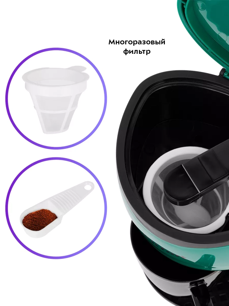 В капельной кофеварке вода нагревается, после чего поступает через фильтр с молотым кофе в кружку. Многоразовым фильтром можно пользоваться неограниченное количество раз.