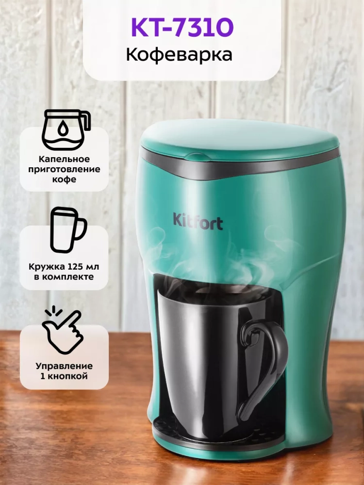 Капельная кофеварка Kitfort КТ-7310 готовит ароматный черный кофе из молотого кофе. Кофеварка отличается компактностью и поместится на любой кухне. Она позволяет легко и быстро приготовить кофе на одного человека.