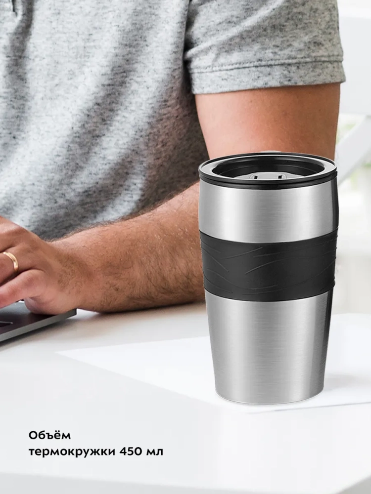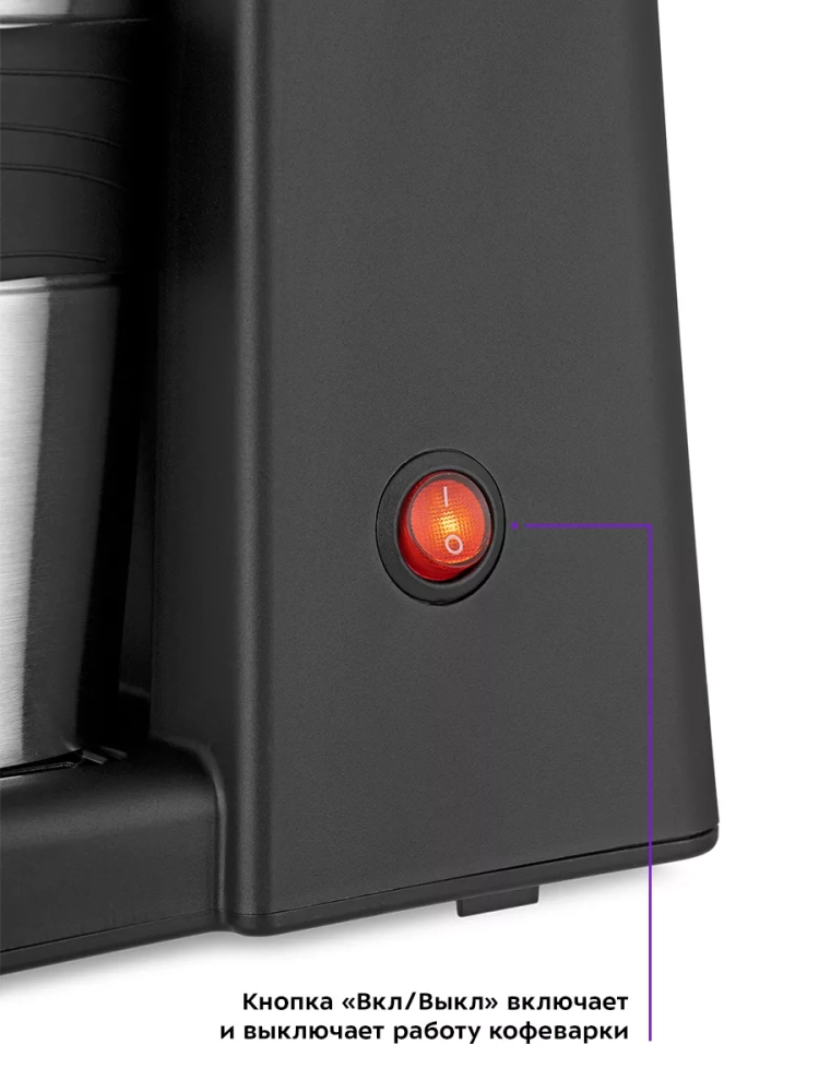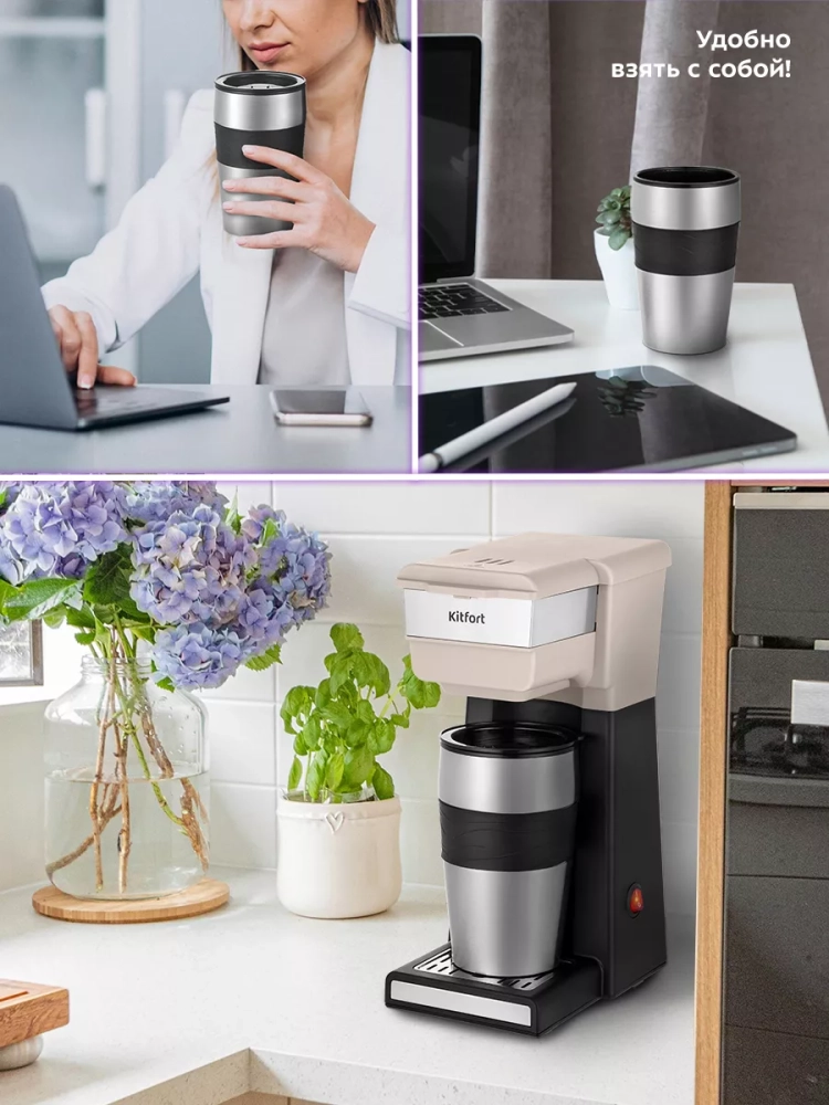 В кофеварке горячая вода медленно поступает в фильтр с молотым кофе. Пройдя через него, вода попадает в термокружку, которая сохранит тепло вашего кофе. Термокружка выполнена из нержавеющей стали с силиконовой вставкой, которая не дает вам обжечься или выронить из рук термокружку. Крышка термокружки позволяет пить кофе на ходу, благодаря удобной форме отверстия для питья, которое можно закрывать, например, при ходьбе.