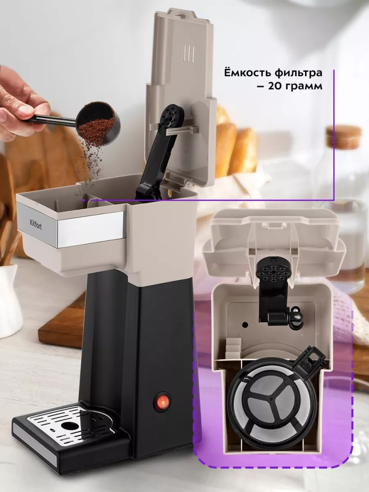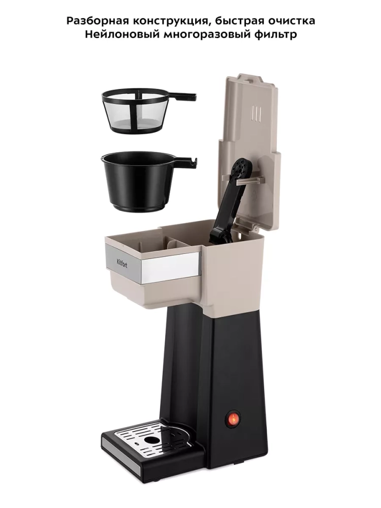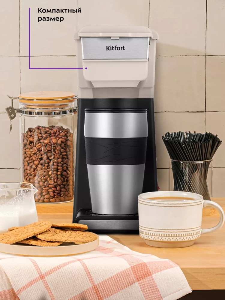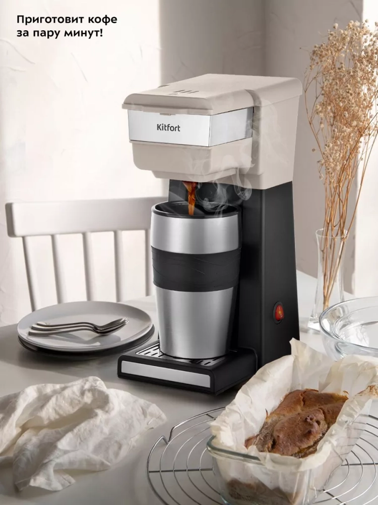Капельная кофеварка Kitfort КТ-7311 готовит ароматный черный кофе из молотого кофе одним нажатием кнопки.