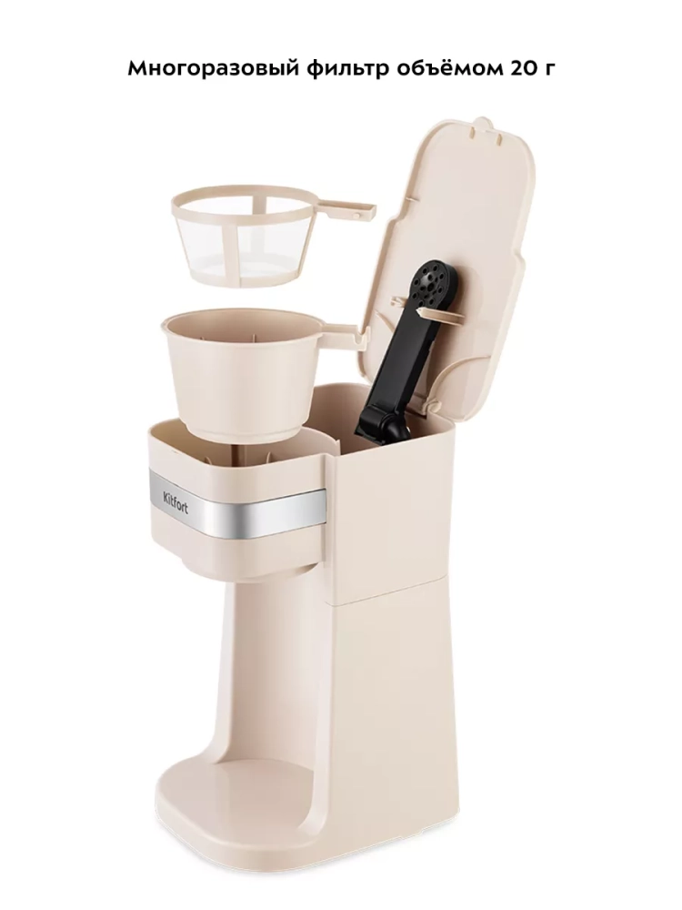 Многоразовым фильтром можно пользоваться неограниченное количество раз. Сетка фильтра изготовлена из нейлона. Фильтр вмещает 20 грамм молотого кофе, а резервуар для воды имеет емкость 450 мл.