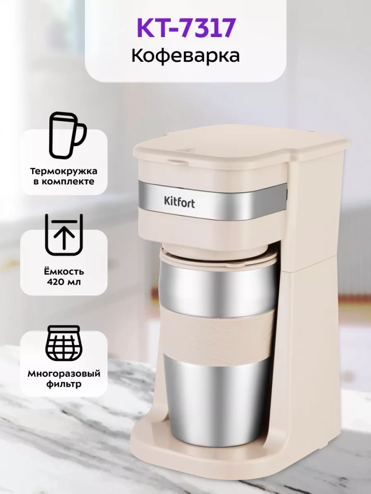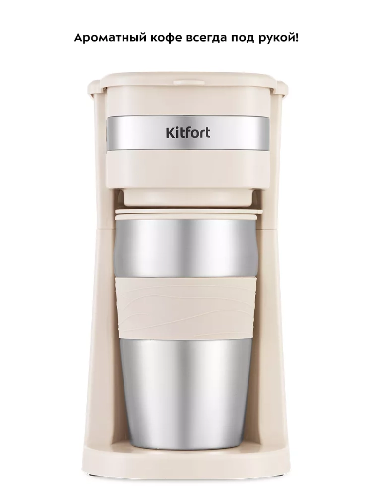 Капельная кофеварка Kitfort КТ-7317 готовит ароматный черный кофе из молотого кофе одним нажатием кнопки.