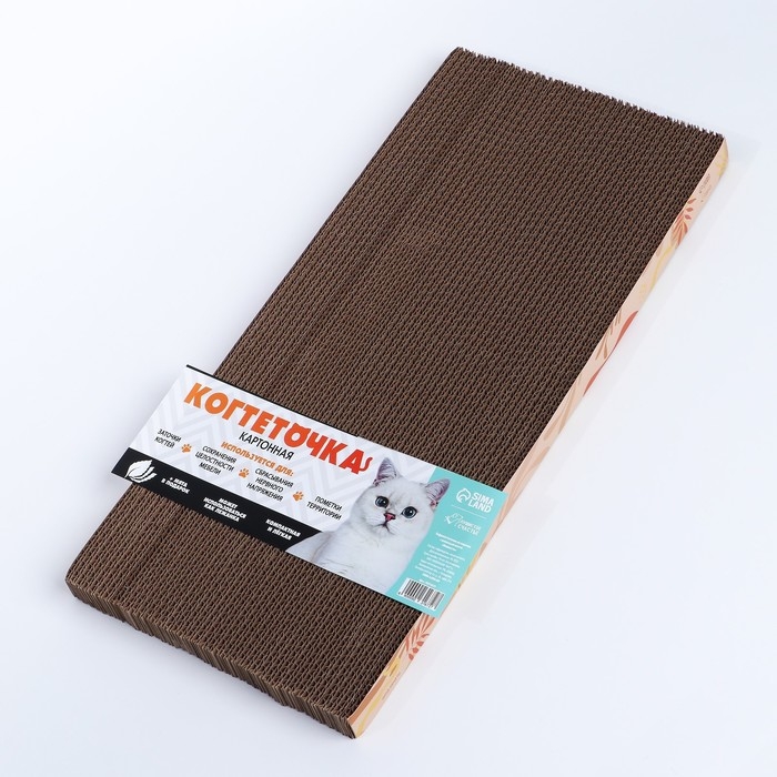 Изделие из гофрокартона выполнено из натуральных материалов и безопасно для когтей котов и кошек. Структура когтеточки напоминает питомцам кору дерева, поэтому изделие привлекает их внимание и является антистрессом.