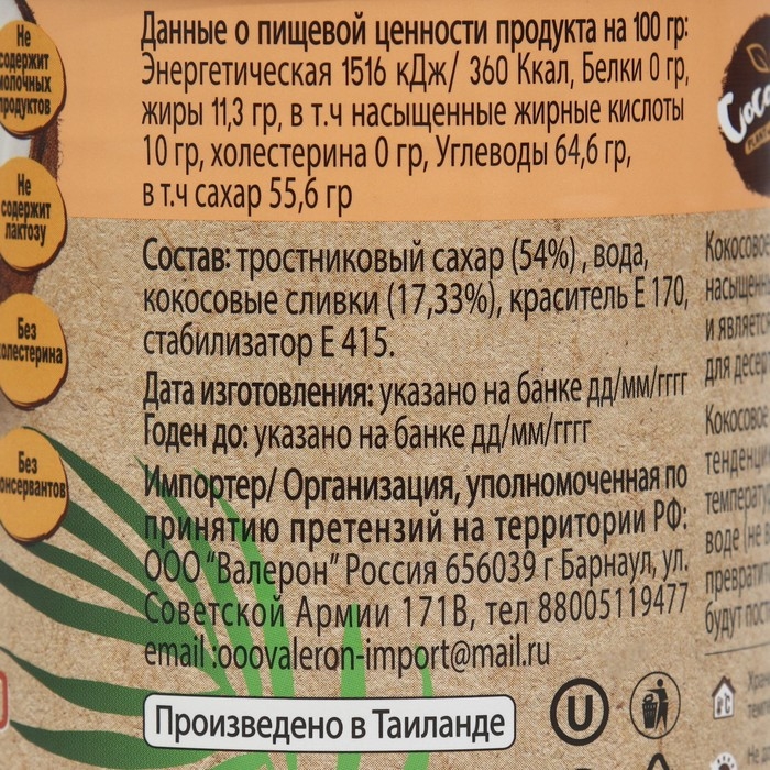 Состав: тростниковый сахар, вода, кокосовые сливки , стабилизатор.