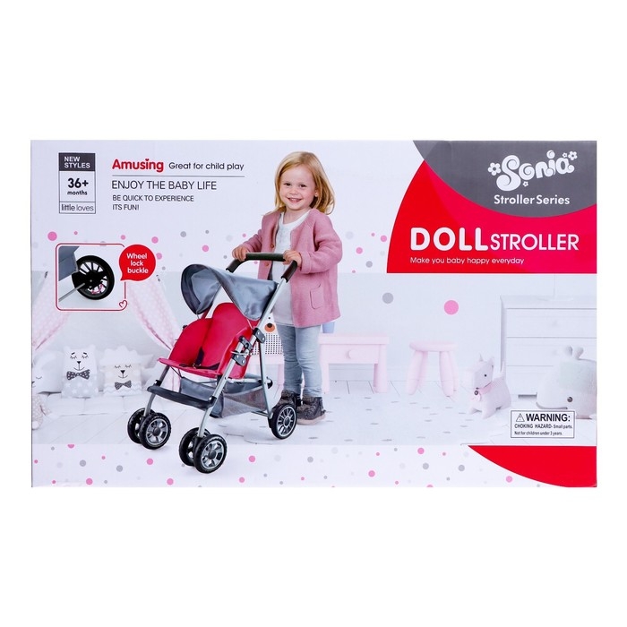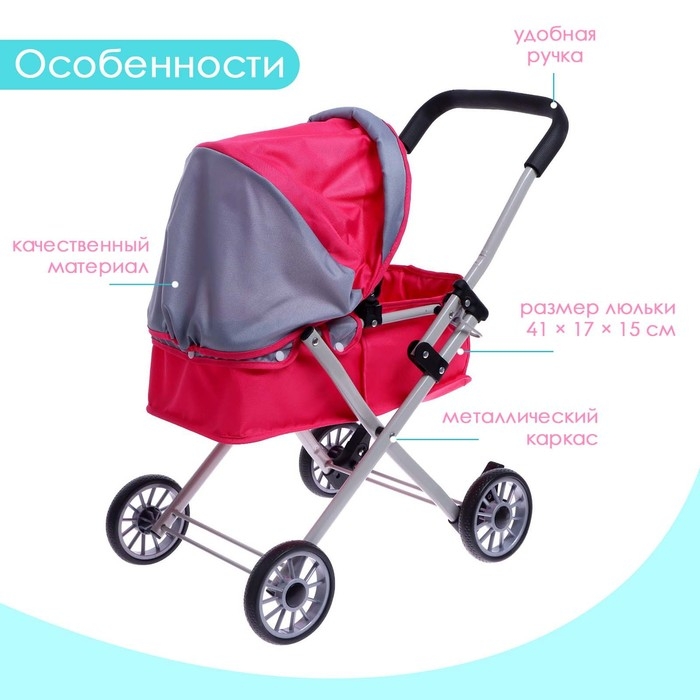 Каркас выполнен из металла, колёса — из пластика. Размер коляски в собранном виде: 56 × 35 × 60 см. Изделие компактно складывается и не занимает много места при хранении. Коляску удобно брать с собой в путешествие, на прогулки или в гости. Короб съёмный. Коляска предназначена для использования не только дома, но и на улице в любую погоду.