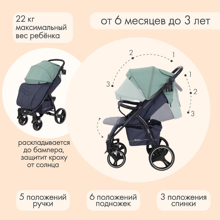 - Широкий капюшон, раскладывающийся до бампера, защитит кроху от осадков, ветра, палящего солнышка