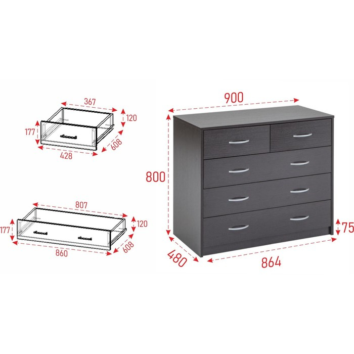 Комод 5 ящиков, 900х480х800, Венге темный