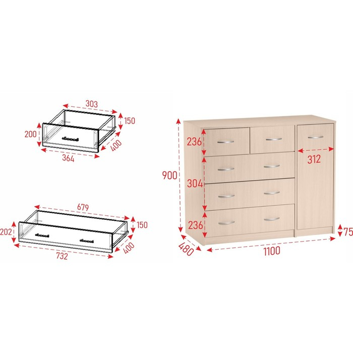 Комод 5 ящиков с дверью, 1100х480х900, Венге светлый