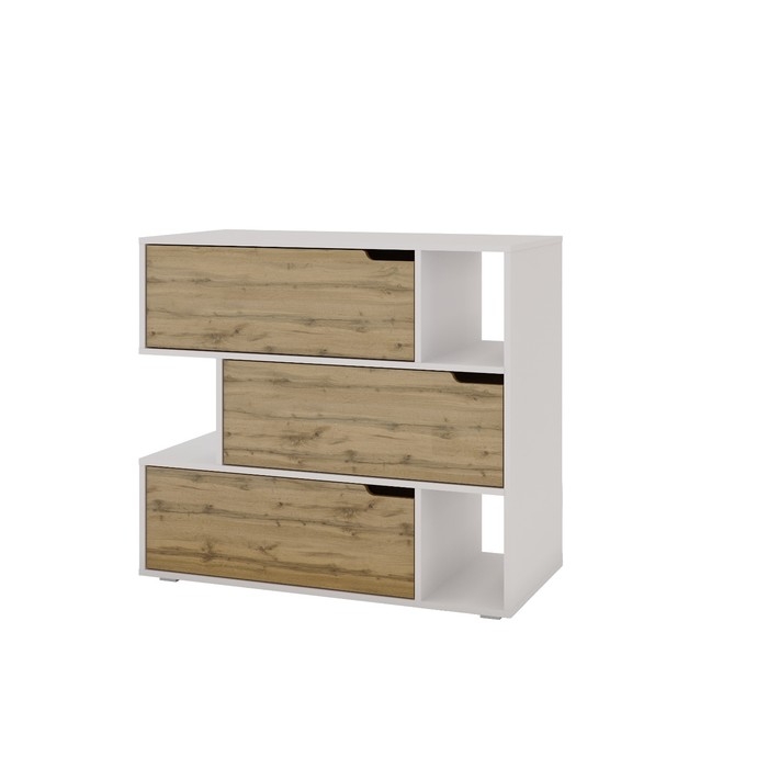 - Тумба доступна в современной и стильной цветовой комбинации "Белый/Дуб вотан". Белый цвет создает чистоту и светлость, а ящики в цвете Дуб вотан, добавляют современный промышленный акцент.