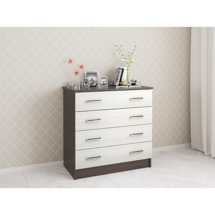 Комод Катрин-3, 810х435х820 - это удобный и универсальный предмет мебели. Четыре выдвижных ящика с роликовыми направляющими. Внешняя фурнитура - лаконичные пластиковые ручки. Материал корпуса и фасада - ЛДСП с ламинированным покрытием.