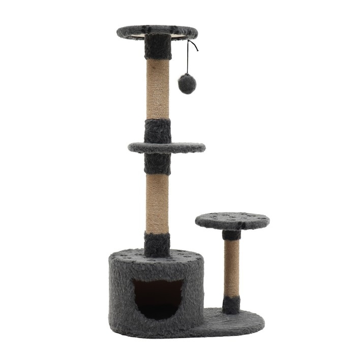Комплекс изготовлен из прочных материалов, таких как джут и искусственный мех, что гарантирует его долговечность и устойчивость к кошачьим когтям. Высота в 107 см и наличие трёх уровней предоставляют кошке пространство для прыжков, лазанья и наблюдений за происходящим вокруг. На первом уровне размещен уютный домик, где питомец сможет уединиться, а верхние уровни идеально подходят для игр и охоты.