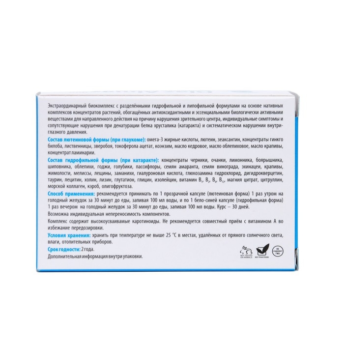 Состав гидрофильной формы (при катаракте): концентраты черники, очанки, лимонника, боярышника, шиповника, облепихи, годжи, голубики, пассифлоры, семян амаранта, семян винограда, эхинацеи, крапивы, жимолости, мелиссы, лещины, заманихи, гиалуроновая кис-лота, глюкозамина гидрохлорид, дигидрокверцетин, таурин, лецитин, холин, лизин, глутатион, глицин, изолейцин, витамин В1, В2, В6, В12, магния цитрат, цитруллин, морской коллаген, кэроб, олигофруктоза.