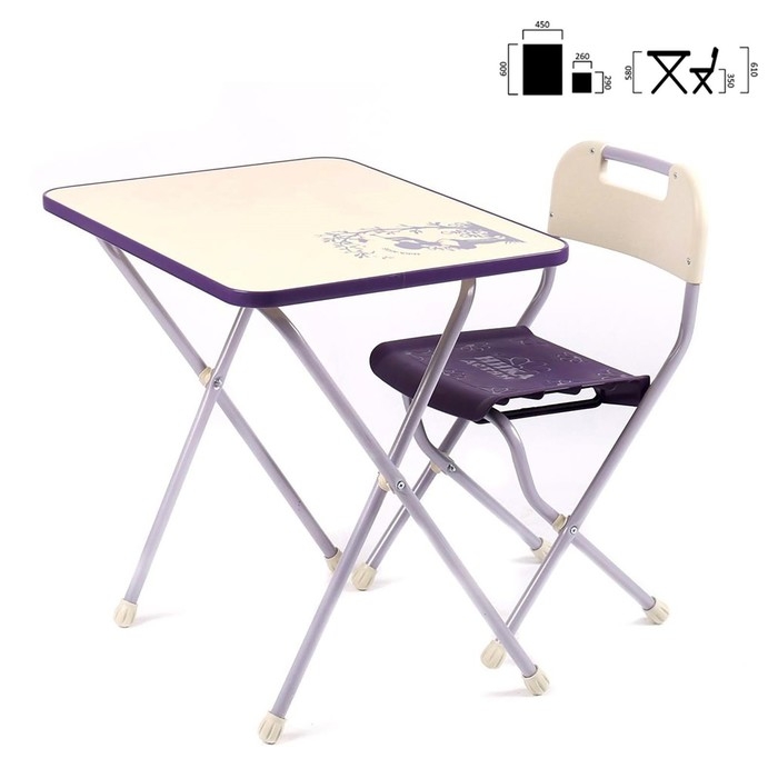 Комплект складной мебели с классическим дизайном и рисунком в стиле «Ретро» поможет обустроить рабочее место ребёнка. В собранном виде комплект не занимает много места и позволяет сэкономить пространство в комнате.