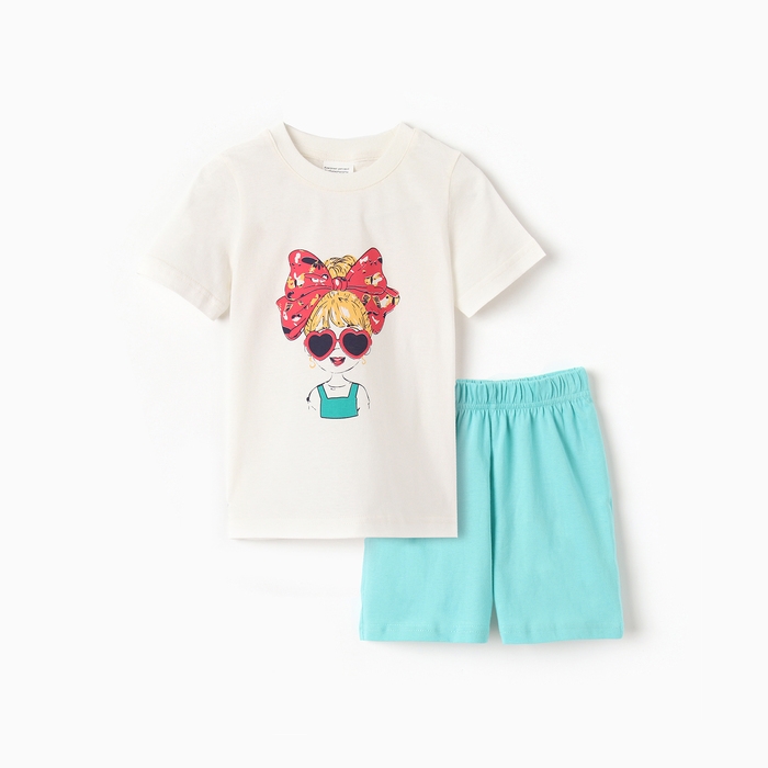 Комплект для девочки "Девочка" (футболка/шорты), цвет молочный/бирюзовый, рост 104-110 см