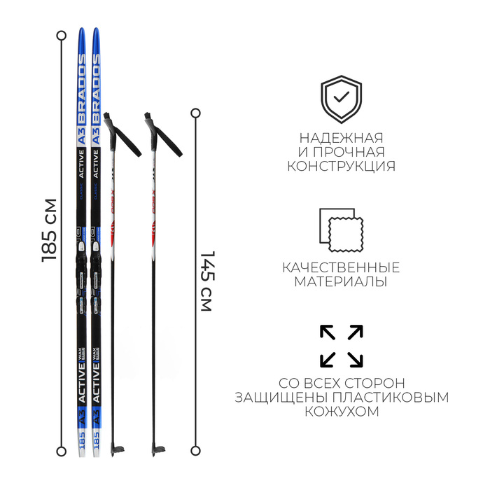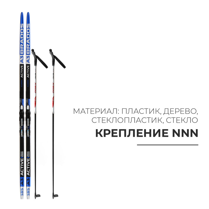 Комплект лыжный: пластиковые лыжи 185 см без насечек, стеклопластиковые палки 145 см, крепления NNN