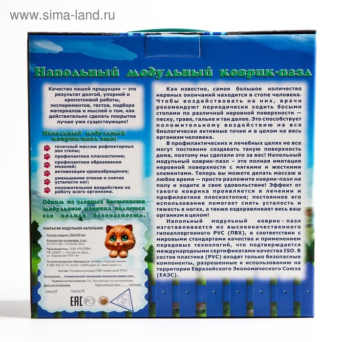 Ортопедическое напольное покрытие состоит из отдельных модулей, которые соединяются между собой по принципу пазла. По массажному коврику можно ходить или выполнять упражнения, стоя на нём. Во время занятий стимулируются рецепторы на стопе и формируются её физиологические своды. Изделие применяется для профилактики плоскостопия у детей, массажа стоп и снятия усталости ног.