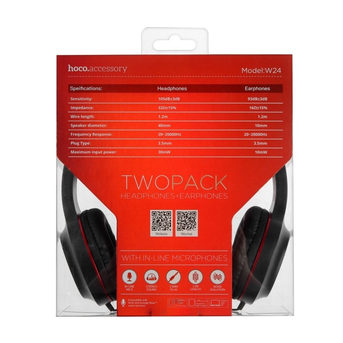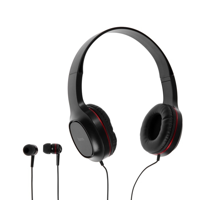Комплект наушников Hoco W24, проводные, накладные + вакуумные, проводные, красные