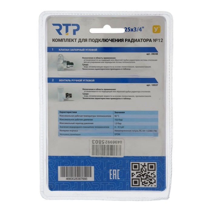 Комплект термостатический для радиатора RTP № 12, d=25 мм х 3/4", угловой