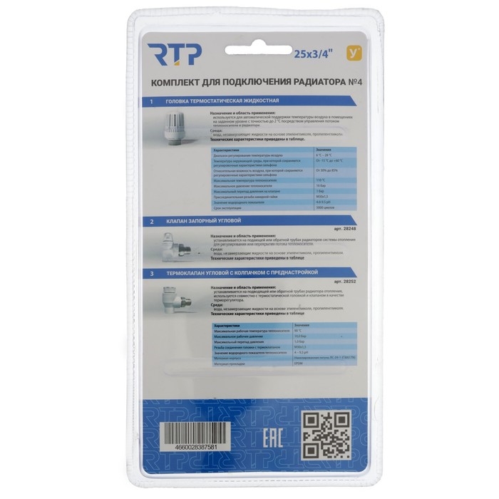 Комплект термостатический для радиатора RTP № 4, d=25 мм х 3/4", угловой
