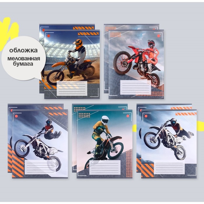 Комплект тетрадей из 10 штук, 12 листов в клетку Calligrata "Мотоциклист", обложка мелованная бумага, ВД-лак, блок офсет, 5 видов по 2 штуки