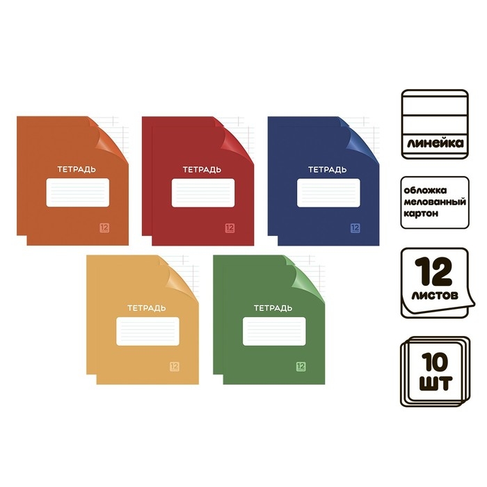 Комплект тетрадей из 10 штук, 12 листов в линию Calligrata "Однотонная Классика с уголком. Эконом", обложка мелованный картон, ВД-лак, блок №2, белизна 75% (серые листы), 5 видов по 2 штуки