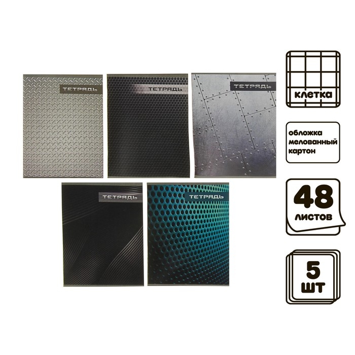 Комплект тетрадей из 5 штук, 48 листов в клетку Calligrata "Металл", обложка мелованный картон, блок №2, белизна 75% (серые листы)