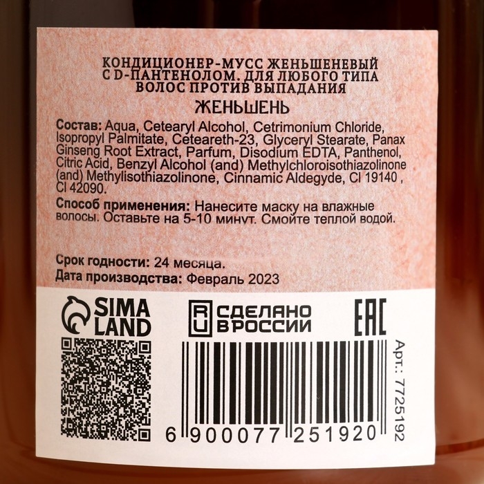 Кондиционер-мусс «Женьшеневый» с декспантенолом рекомендован против перхоти и сухости кожи головы. Укрепляет и питает волосяные луковицы, борется с выпадением волос и способствует их активному росту. Кондиционер-мусс создан для всех типов волос. Придаёт блеск и ухоженный вид волосам, активно восстанавливает их структуру.