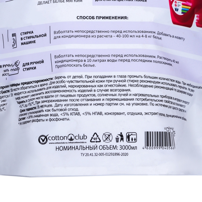 Концентрированная жидкая формула кондиционера хорошо растворяется в воде, делая бельё мягким, шелковистым и приятным на ощупь. Кондиционер устраняет статическое электричество и облегчает глажение, придавая приятный аромат свежести. Не даёт белью пожелтеть даже при полоскании не идеальной водой. Благодаря защитному слою, который образуется на поверхности ткани после стирки с кондиционером, вещи дольше остаются чистыми. Экстракт хлопка восстанавливает ткань и защищает от образования катышков.