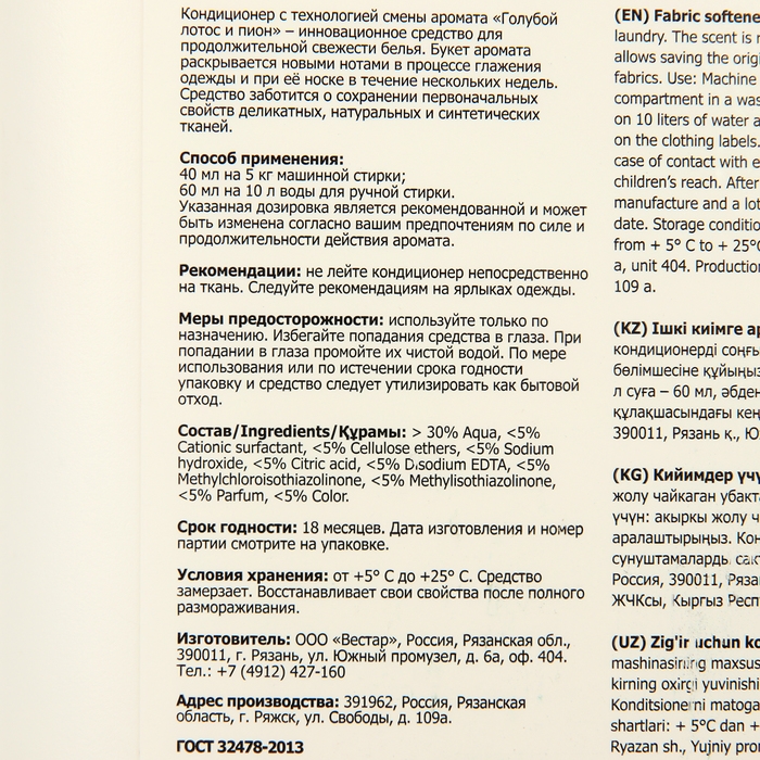 Кондиционер для белья VESTAR "Голубой лотос и пион" — это высокоэффективное средство для смягчения и освежения тканей. Он разработан для использования в стиральных машинах и предназначен для всех типов тканей. Кондиционер обладает приятным ароматом голубого лотоса и пиона, который остается на белье после стирки и создает приятную атмосферу в помещении. Он также помогает уменьшить статическое электричество и предотвращает появление катышков на одежде. Кондиционер для белья VESTAR "Голубой лотос и пион" доступен в удобной упаковке объемом 5 литров, что позволяет использовать его в течение длительного времени без необходимости покупки нового флакона. Это отличный выбор для тех, кто ценит комфорт и свежесть своей одежды.