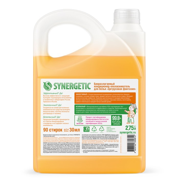 Кондиционер-ополаскиватель для белья Synergetic "Цитрусовая фантазия", биоразлагаемый,гипоаллергенный, 2.75 л