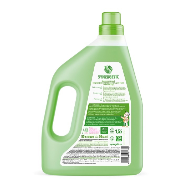 Биоразлагаемый кондиционер-ополаскиватель для белья SYNERGETIC "Райский сад" – высокоэффективное средство, бережно ухаживающее за всеми типами ткани, в том числе деликатными, и придающее особую мягкость и нежность белью после стирки.