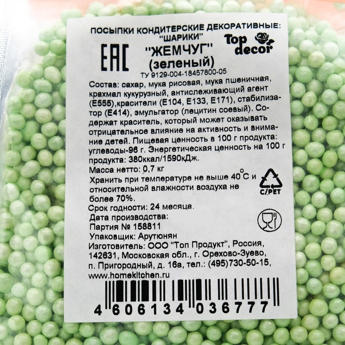 Кондитерская посыпка Top decor, "Шарики Жемчуг", зелёный, 700 г